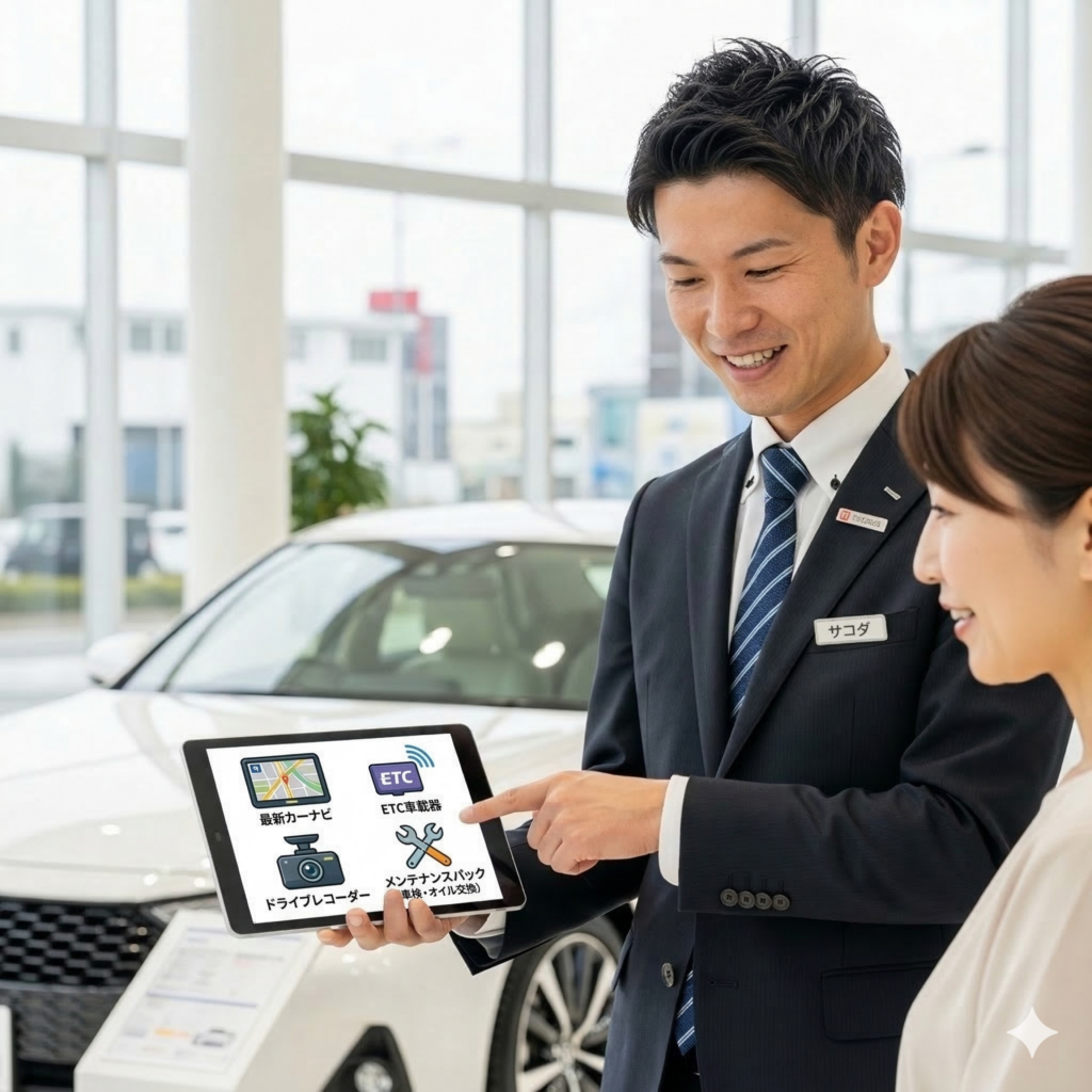 初めての車選びでは、車両本体だけでなく、ナビやETC、さらには購入後のメンテナンス費用まで最初から含まれているプランを選ぶのが安心です。後から追加費用を心配する必要がなく、「突然の故障で大きな出費が…」というリスクも防げるため、車に詳しくない初めて車購入をされる方でも安心です。